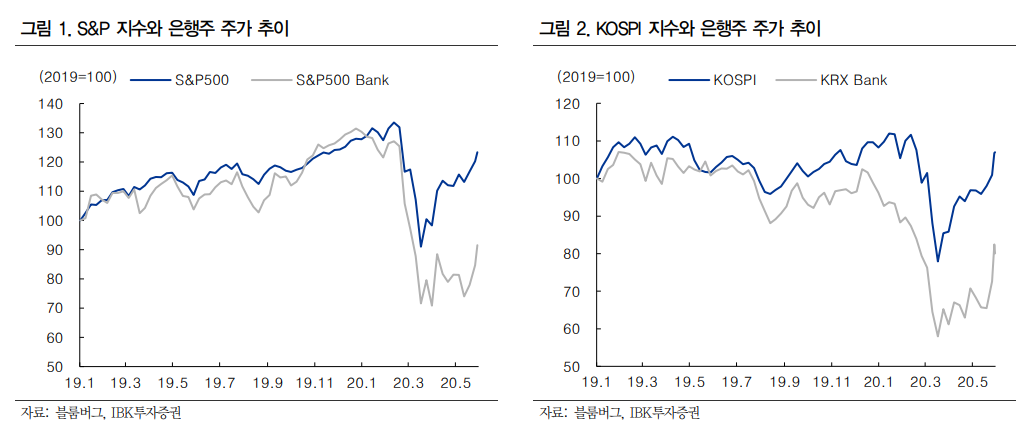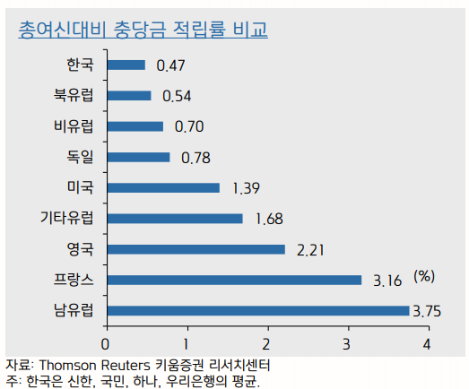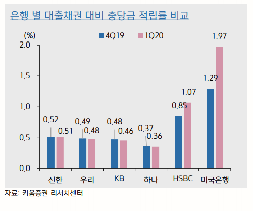 우리나라가 미국 및 유럽 주요국 대비 대손률이 낮지 않음에도 불구하고 충당금 적립은 다른 국가 대비 훨씬 낮은 편. 이번에 우리나라는 락다운이 없어서 경제 피해 덜 했다지만, 미국은행들의 대손충당금 적립 규모와 비교한다면 용감해 보이는 수준의 대손충당금 적립.