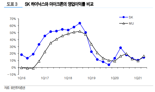 SK하이닉스와 마이크론은 아주 유사한 사업 구조로, 서로 비교가 많이 되는 상황. 영업이익률 추이도 거의 비슷하다.