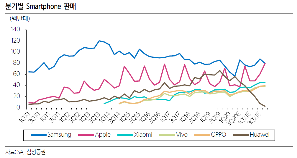 삼성전자의 분기별 스마트폰 판매량은 약 8천만대 안팎. 올해는 약 3억대 정도를 판매할 것이라고 예상.