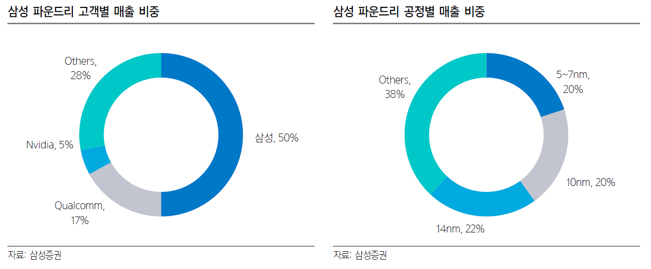 삼성 파운드리는 내부 삼성전자향 매출이 절반 정도. 퀄컴의 통신칩은 예전부터 판매하고 있었고 이번에 엔비디아 제품도 판매. 애플의 칩을 설계하지 않은지는 꽤 되었다. 요새 유명한 GTX 30 시리즈도 삼성전자 작품. 사고싶다...