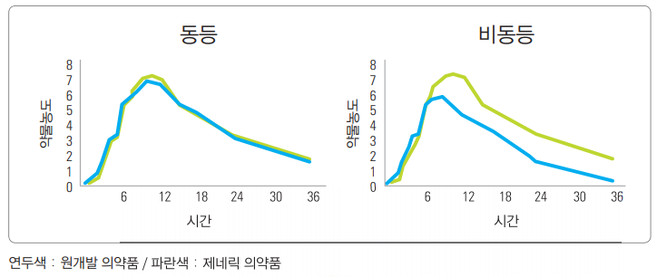 - 생물학적 동등성: Bio Equivalence, 체내에서 흡수되는 양이나 약물 농도 등이 동일하게 유지되는지, 즉 약을 잘 베꼈는지 확인하는 과정. 동일한 약효를 가지고 작동하는지 확인.