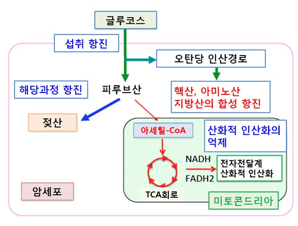 이렇게 암세포는 변형 과정에서 특정 대사과정에 대한 의존도가 크게 높아지는데 (위 경우에서는 글루타민에 대한 의존도가 크게 증가한다), 이러한 암세포와 일반 세포의 상이한 대사 과정을 방해하는 것이 대사항암제의 주 기전이다.
