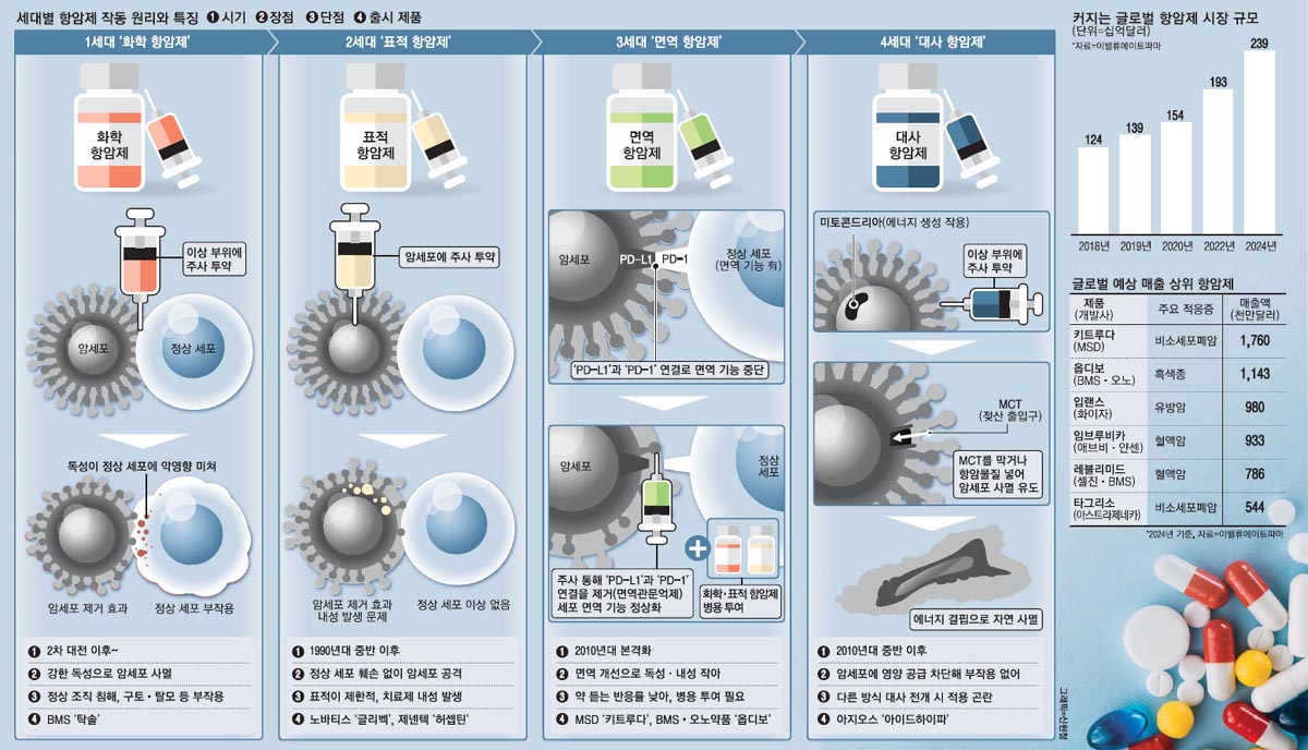 항암제에는 여러가제 세대가 있다. 크게 4가지 세대로 나눠서 보고 있다. 1세대는 화학 항암제, 2세대는 표적 항암제, 3세대는 면역 항암제, 4세대는 대사 항암제.