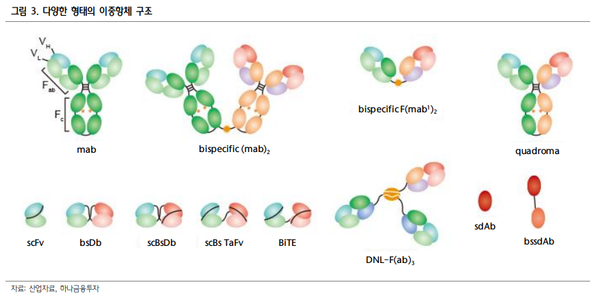 두 가지 항원에 결합하게 만드는 항체로, 한쪽에는 암세포를, 한쪽에는 면역세포를 결합시켜서 면역 반응을 끌러올리는 컨셉이 가능하다. 인공적인 항체라 다양한 형태로 만들 수 있다.