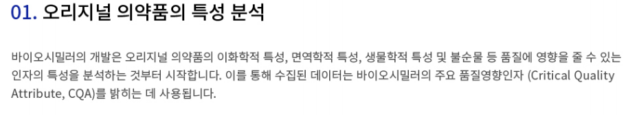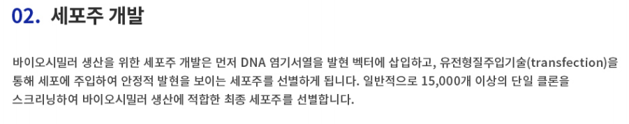 삼성바이오로직스에서 깔끔하게 정리되어있는 내용이 있어 이미지로 첨부. 일단 염기서열을 따서 어떤 단백질인지를 보고, 오리지널 의약품이 어떤 특성을 가진 약품인지 분석. 그리고 어떤 세포에 해당 염기를 삽입해야 안정적인 발현을 보이는지 세포주를 개발하고, 생산 공정을 개발. 공정에 따라 또 약품의 특성이 달라지니 중요하다.