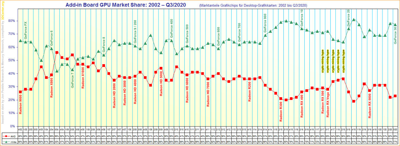 아주 최근까지 업데이트 된 자료는 아니지만, 엔비디아가 AMD에 비해서는 높은 점유율을 가진 것으로 보인다. 2000년도 초반에는 비슷한 점유율을 보이다가 최근에는 크게 벌어진 격차가 좁혀지지 않는 상황.