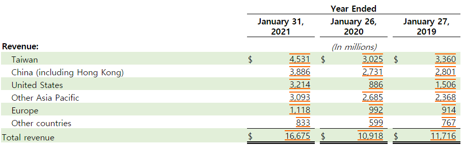 아래는 지역별 매출과 용도별 매출. 용도별 매출은 위와 동일. 지역별 매출은 대만과 중국, 아시아 계열이 높다. 아마 PC나 서버 조립이 대부분 대만에서 일어나기 때문일 것 같다. 10-K에 따르면 최종 고객의 위치가 다르더라도 일단 최초에 Billing이 일어나는 지역을 기준으로 매출을 잡는다고 한다.