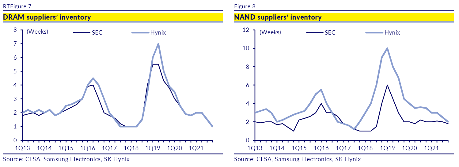 메모리 ASP는 팬더믹으로 촉발된 IT 수요와 데이터 센터들의 재고축적으로 인해 상승세를 유지해 왔다. 컨센은 강한 수요와 ASP의 유지를 기대 하고 있으며 메모리 공급업체들도 똑같이 강한 수요를 예상하고 있는 것 같다.