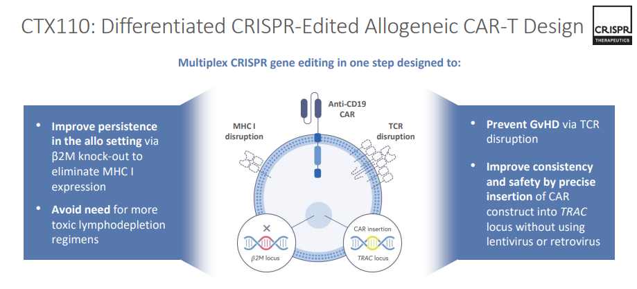 CRISPR-Cas9 유전자 가위를 이용해 (1) CAR 구조체 삽입과 함께 (2) TCR(T Cell Receptor) Knock Out (3) MCH1 Knockout 을 동시에 진행하고, (1) 암세포를 선택적으로 죽일 수 있는 능력과 (2) GVHD 문제를 해결 (3) 면역거부반응 억제를 동시에 꾀한다는 설계다.
