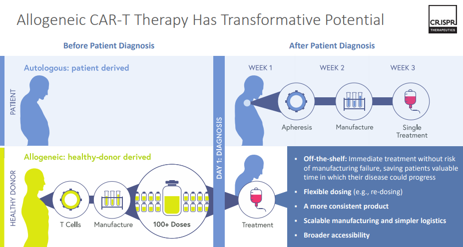 그 외에 해외 상장사 중 CRSP: Crisper Theraputics가 이러한 치료방법을 노리고 있다. 유전자 조작을 통한 CAR-T 세포를 만들어, 동종 이식을 하더라도 면역반응이 없는 제품을 만들겠다는 것.