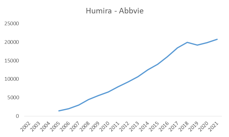 5. Humira: 휴미라도 Remicade와 유사한 사례로, 2023 특허 만료를 앞두고 있으나 매출의 기세가 엄청나다.