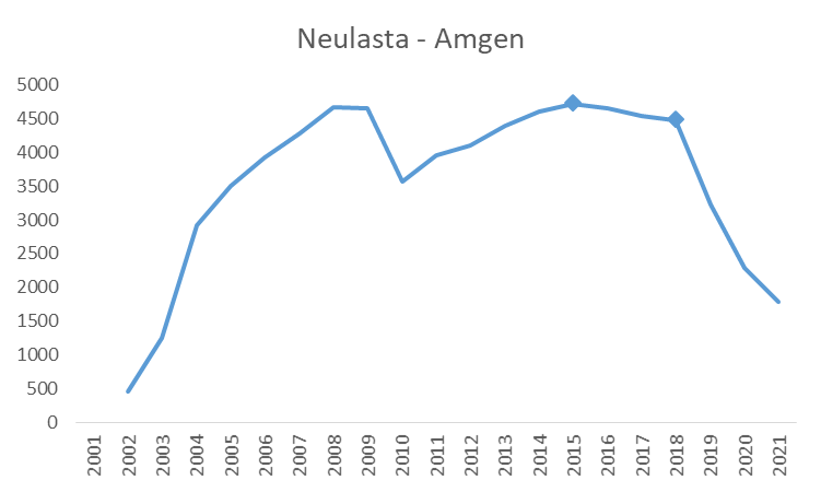 6. Neulasta: 초반에 빠르게 피크 매출을 달성하고, 한동안 부진한 아바스틴 같은 케이스. 2015년 미국 특허 만료, 2017년 유럽 특허가 만료.