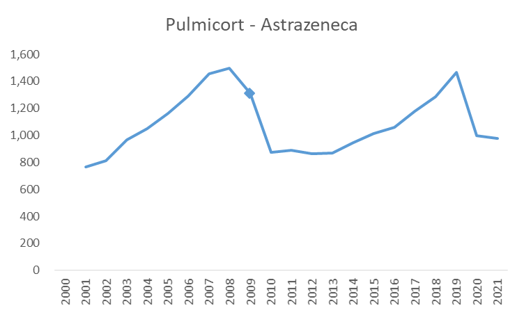 10. Pulmicort: 역시나 2009년경 Teva와의 특허 분쟁으로, Teva가 Pulmicort의 제네릭 버전을 판매할 수 있게 되면서 매출이 조기에 감소하고 이후 회복.