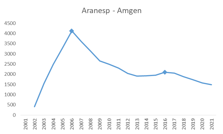 7. Aranesp: 유럽 특허 만료는 2016년이나, 2006년 말 2007년에 약품의 안전성 관련 이슈가 불거지면서 특허 만료 전에 매출이 급감.