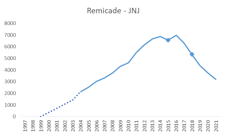 4. Remicade: 2015년 유럽 특허 만료, 2018년 미국 특허 만료. 매출이 특허 만료 전까지 계속해서 안정적으로 증가하기도 한다.