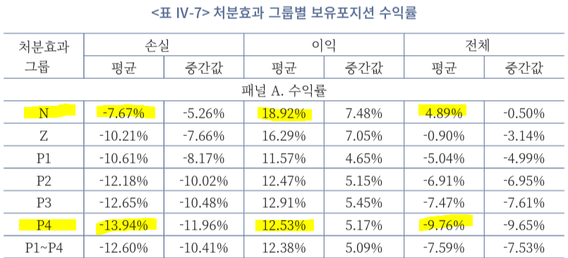 그룹N은 역의 처분효과가 나타나는(이익은 길게, 손실은 짧게) 가져가는 그룹, P4는 처분효과가 가장 높은 그룹(이익은 짧게, 손실은 가장 길게). N이 P4에 비해 수익률이 통계적으로 아주 유의미하게 좋다.