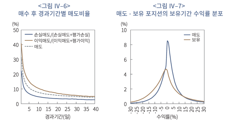 (6) 개인투자자가 매수한 주식의 수익률은 매도한 주식의 수익률보다 낮다. 이익에 대해서는 위험회피 경향을, 손실에 대해서는 위험선호 성향을 보인다. 특히, 매도 의사결정은 수익률의 크기보다는 손익여부에 영향을 받는다.