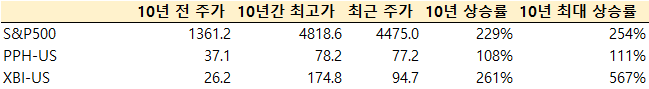 이를 ETF측면에서 비교해보면, 제약사 ETF인 PPH는 10년간 2배 올랐다. 진짜 1년에 딱 7% 정도 오른 셈. 반면에 잡주 바이오테크로 이뤄진 XBI는 10년간 3배 넘게 올랐고, 최대 상승률로는 6배도 넘게 오른 구간이 있다.