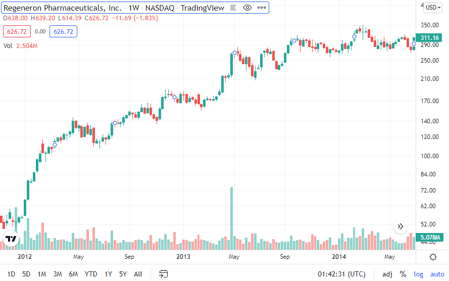 반면 노베이스 원챔 리제네론의 경우, 아일리아 하나가지고 돈을 이렇게 벌기 때문에 오히려 베타가 높고 주가 상승이 높다.