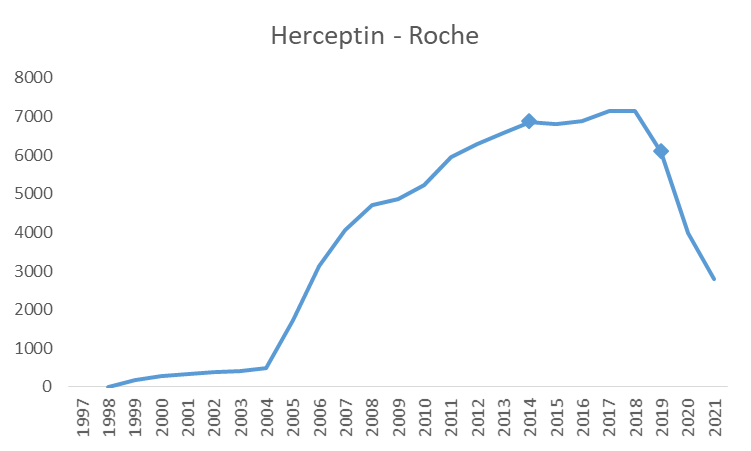 빅파마의 경우 신약이 출시되면, 약 7~10년에 걸쳐서 매출이 점증하나, 특허 만료 / 경쟁 약품의 출현 등으로 15년 경에 매출은 급격하게 감소한다. 거의 1~2년만에 매출은 반토막 혹은 1/3토막 이상이 난다. 특히나 바이오의약품이 아니라 합성의약품의 경우 매출 감소는 더욱 드라마틱하다.
