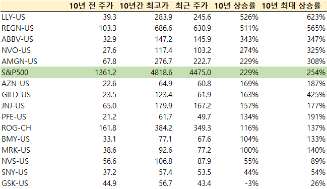 상위 빅파마 업체들 15개를 보면, 10년간 S&P500을 상회한 상승률을 보인 종목은 5개밖에 안된다. 심지어 Regeneron 같은 경우는 빅파마라고 보기도 좀 그렇다. 15개 중 10개가 지난 10년간 S&P500을 하회했는데 수익률이 10년간 2배가 안되는 종목도 5개가 넘는다. 1년에 7%도 못올랐다는 뜻이다.