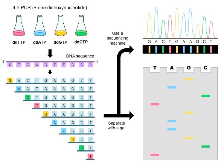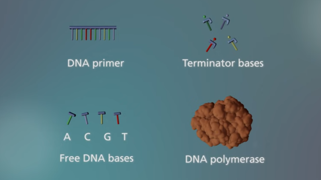 원래는 DNA 복제를 위한 재료로 ACGT 염기를 넣어주는데, 염기서열 분석에서는 이러한 일반 염기와 함께, 형광물질로 표기된 Terminator Base를 같이 넣어준다. 이들 염기는 일반 ACGT 염기와 동일하게 합성에 관여하나 다른 점이 있다.