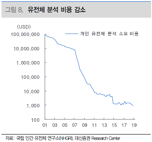 일루미나는 이러한 유전자 비용 분석 과정에서 가격을 극적으로 낮추면서 산업 발전에 크게 기여했다... 자료에 따라 상이하나, 그 덕분에 Illumina는 차세대 유전자 분석 시장(NGS)에서 약 70~90%의 점유율을 가진 것으로 추정하고 있다.