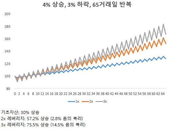 2x 레버리지는 등락이 약 10회, 20거래일(약 1달) 반복되었을 때 3.3% 정도의 음의 복리가 발생한다. 3x 레버리지는 같은 기간 약 10%의 음의 복리가 발생한다.