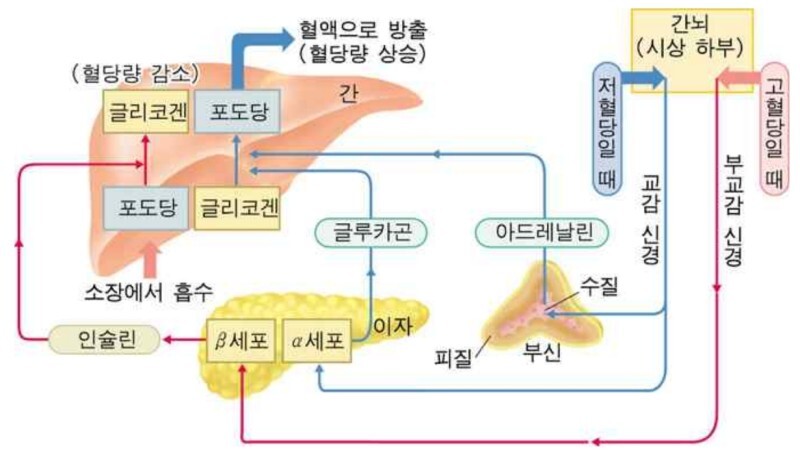 가장 대표적으로 알려진 혈당 조절 메커니즘은 글루카곤과 인슐린을 통하는 것이다.
