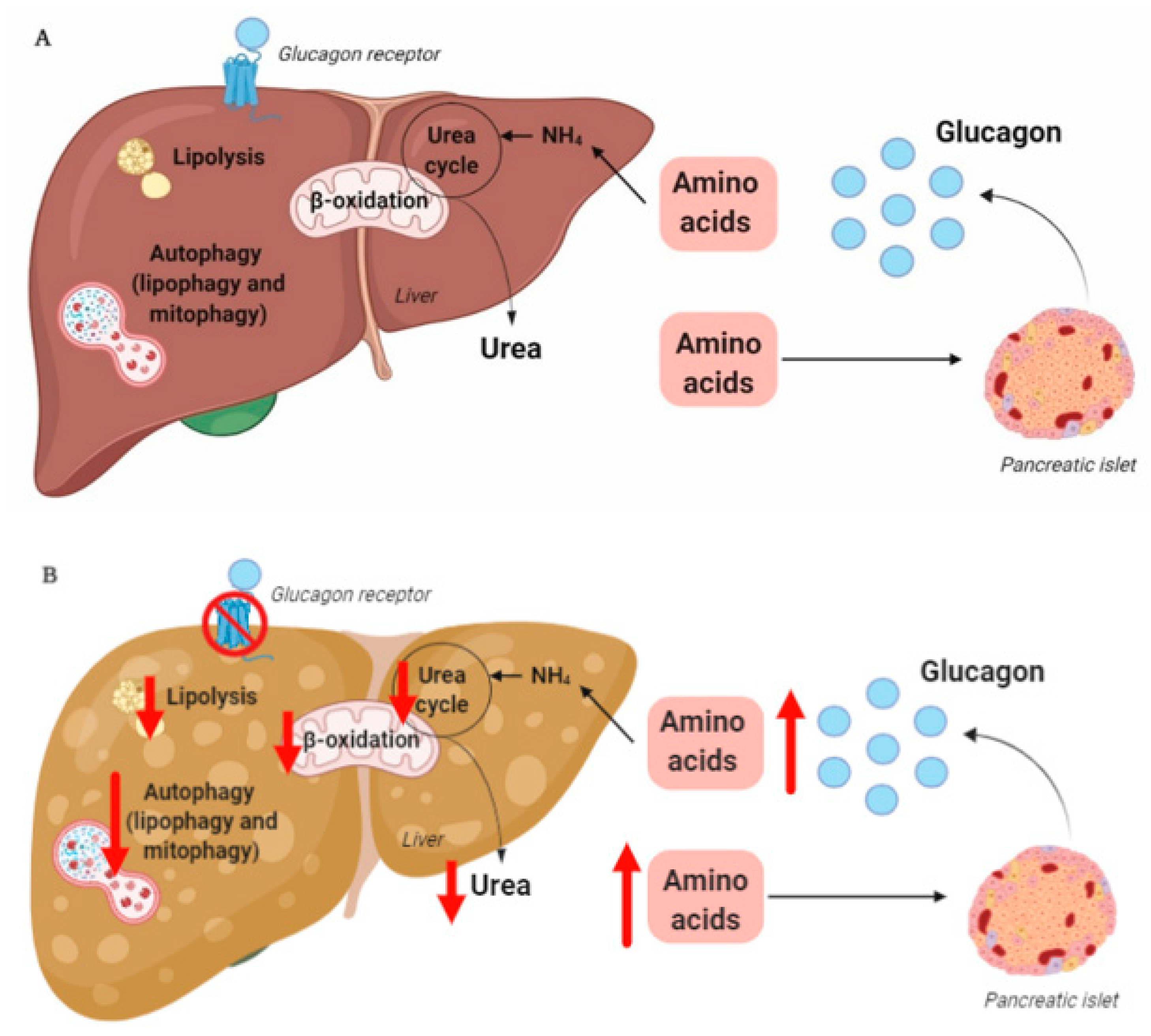 글루카곤은 간의 글루카곤 수용체에 결합하여 간에서 지방의 분해 및 아미노산의 분해와 부산물로 발생하는 암모니아를 요산으로 전환하는 과정에 관여한다. 이는 혈중 아미노산 수치를 떨어트린다. 혈중 아미노산 수치의 감소는 췌장에 영향을 미쳐 글루카곤 분비를 조절한다. 이를 Liver-Alpha-Cell-Axis라고 부른다.