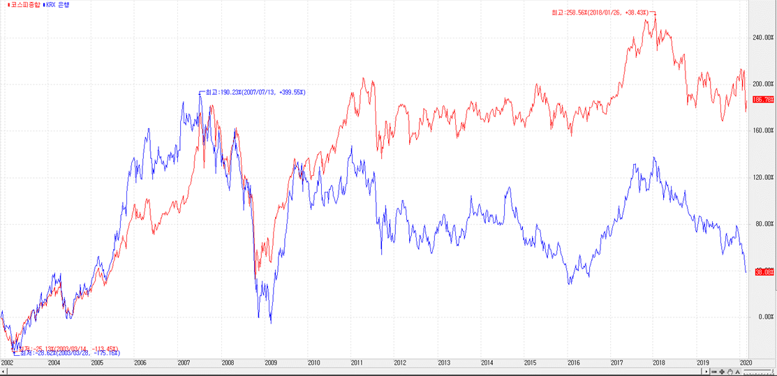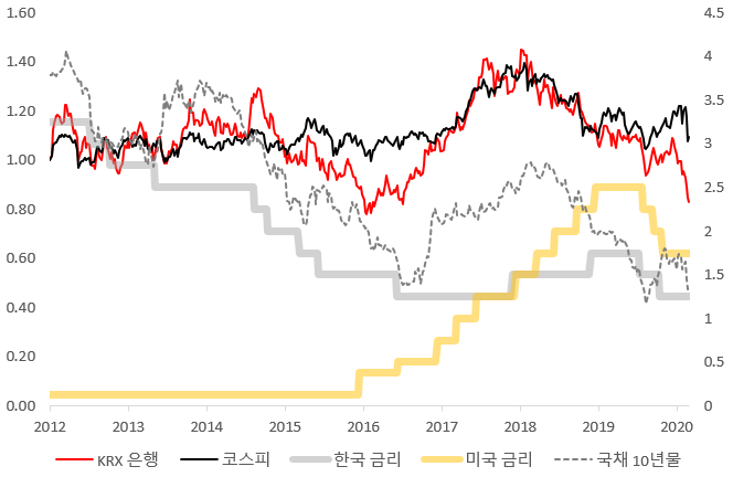 잡설이 길었습니다만, NIM이 떨어질 위기에 처했습니다. 특히 이번 CoV19영향으로 인해 경기 둔화가 우려되며, 은행의 이익 성장을 기대하기 어려운 상황입니다. 오히려 대손률의 증가로 인한 은행 손실 우려가 불거질 수 있는 상황입니다. 그러나 경기가 다시 회복하면서 시중금리가 올라오는 시기에는 주가 역시 반등 가능할 것으로 보입니다.