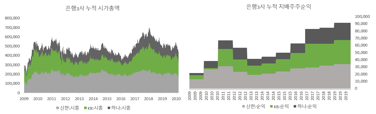 우리금융지주가 특히 심한 편이지만, 다른 금융지주사들도 비슷합니다, 도찐개찐입니다. 2019년 대부분 역대 최고 수준의 이익을 기록하고, 배당수익률은 4%를 상회, PER은 6배가 안됩니다. 너무 쌉니다. 요즘 CoV19사태로 인해 안비싼 주식이 없다지만 그래도 너무 쌉니다. 은행 3사의 지배주주 순익은 역대 최대 규모지만, 합산 시총은 역대 최저 수준입니다.