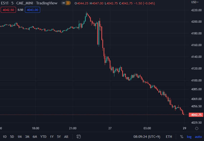예상하던대로 매파적이었으나, 아 시장에서는 전혀 그렇게 받아들이지 않는구나, 그러면 롱 비중을 좀 더 늘려야겠다 라고 생각을 했고 롱을 늘리니, 그때부터 다시 본격적인 하락이 시작되었고 S&P 500 지수는 하루 3%를 넘는 낙폭을 냈다.