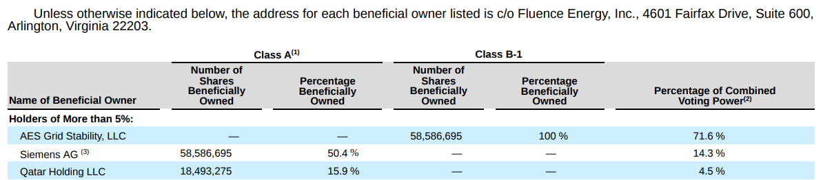 회사의 최근 Proxy를 기준으로 보면, 대주주인 AES와 Siemens, Qatar 투자청에서 대부분의 지분을 가지고 있습니다. 주권은 주당 투표권이 5주가 있는 Class B-1과 보통주인 Class A로 나뉘며, AES가 Class B-1을 전량 보유하며 의결권의 71.6%를 가지고 있다. 그 외에 Siemens가 14.3%, Qatar Holding이 4.5% 정도 보유중입니다.