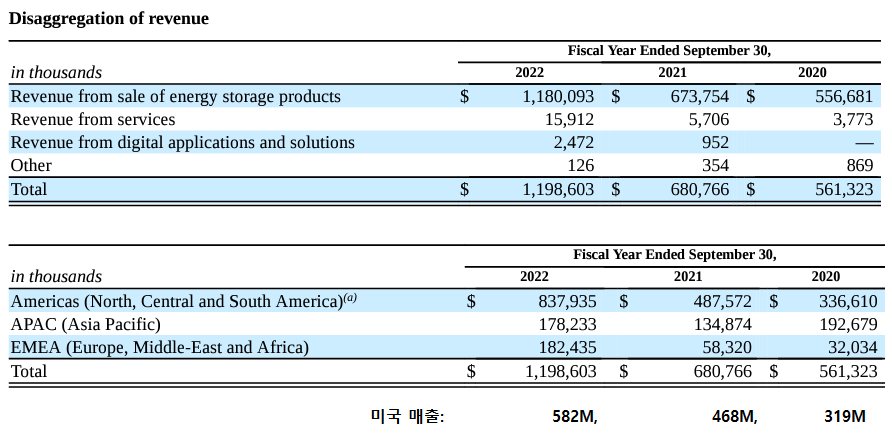 회사는 ESS를 판매하고 ESS 운영에 필요한 서비스와 OS를 제공하는 기업입니다. 매출은 아래와 같이 구성되어 있습니다. 기본적인 원가가 높아 매출의 대부분은 ESS 판매에서 나오며, 서비스 매출 및 어플리케이션과 솔루션 매출은 비중이 낮습니다. 주요 매출 지역은 2022 회계연도 말 기준 미국이 약 50%, 미국을 포함한 미주가 70%, APAC과 유럽이 15%씩을 차지하고 있습니다.