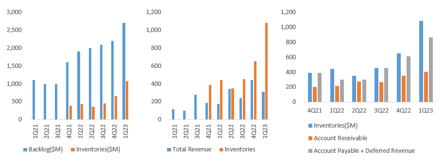 다만 1QFY23 실적발표에서 동사는 현재 $2.7B 규모의 수주잔고 중 약 72%가 내부자 매출이 아니라고 언급 하였다는 점에서 긍정적이며, 재고가 빠르게 늘어나고 있지만 Deferred Revenue와 Account Payable이 맞춰 증가하면서, 추가적인 외부 현금 조달 없이 수주잔고에 필요한 재고를 마련하고 있다는 점도 긍정적인 부분입니다.