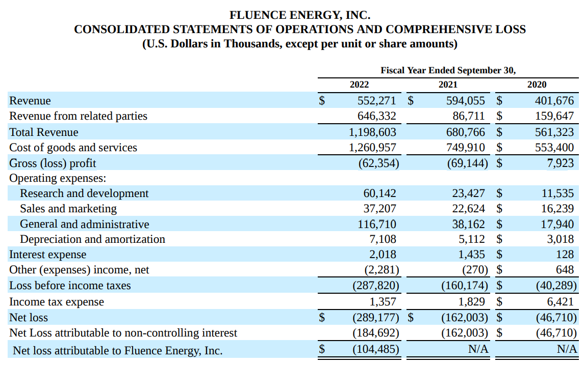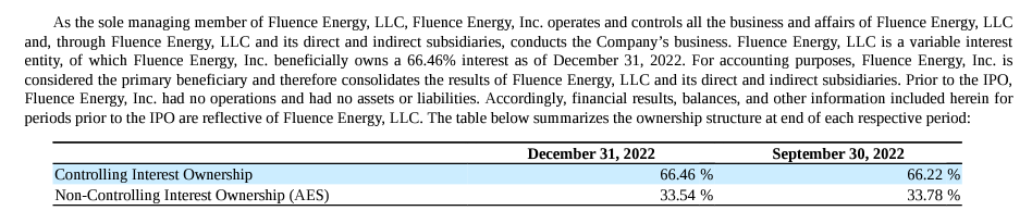 동사의 기업 구조도 조금 특이한데, 상장된 모회사인 Fluence Energy Inc가 사업 자회사인 Fluence Energy LLC를 보유하는 형태로 사업을 운영중이며, 모회사의 유일한 사업은 Fluence LLC를 보유하고 있는 것이다. 이 자회사이자 실제 사업회사인 Fluence LLC는 또 모회사인 AES가 33.54%의 지분을 보유중입니다. 따라서 전사 이익의 2/3정도만이 지배주주 순이익이니 밸류에이션 하거나 기업가치를 볼 때 유의해야 합니다.