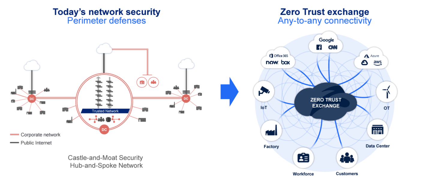 Zero Trust와 다른 시스템의 차이를 알려주는 장표. 단순히 말하면 우리가 신뢰할 수 있는 네트워크 내부에서 일어나는 활동은 감시하지 않고, 네트워크 안과 밖만을 감시하는걸 기존 네트워크라고 한다면... Zero Trust는 네트워크 내에서 일어나는 모든 활동을 일단 감시하고 보는 식... 신뢰할 수 있는 네트워크 내의 활동도 "Trust" 하지 않겠다는 것.