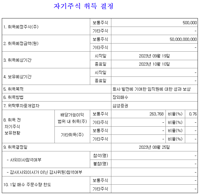 그리고 8월 28일 두나무의 자기주식 취득 결정 공시, 기존에 약 26만주 정도를 배당가능한 주식으로 보유중이었는데, 50만주 (500억원)규모를 추가적으로 취득한다. 장외에서 삼성증권을 통해서 매수한다.