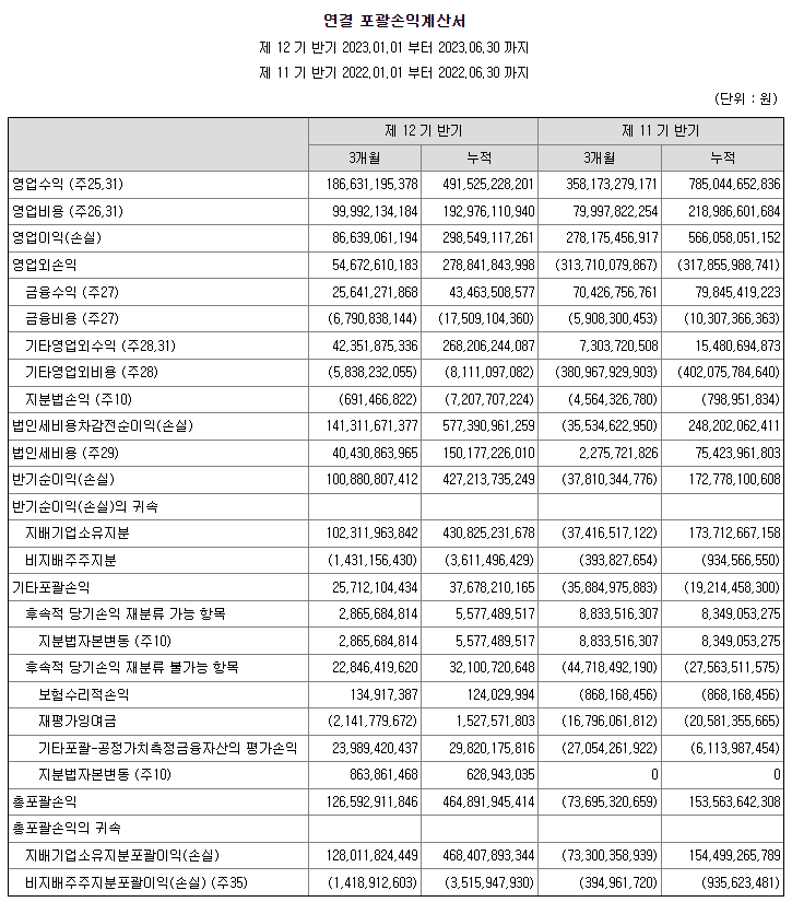 두나무의 2023년 반기 보고서가 얼마 전에 나왔다. 영업수익은 전 분기 대비 약 40%정도 하락한 1,866억원 수준. 영업이익은 약 분기에 866억정도 발생했다. 이 또한 전분기 대비 약 60% 감소.