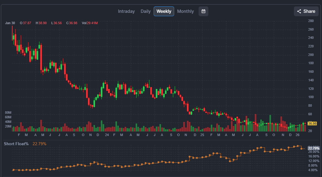 공매도 잔고가 꾸준히 증가해서 20% 수준까지 오고 있음. 내려가면서 공매도 잔고가 늘어가다가 한번씩 세게 튀는 케이스를 자주 보고 있음. 수급상으로는 유리하다고 생각. $2B 이상 기업 중 ENPH의 공매도율은 상위 45위.